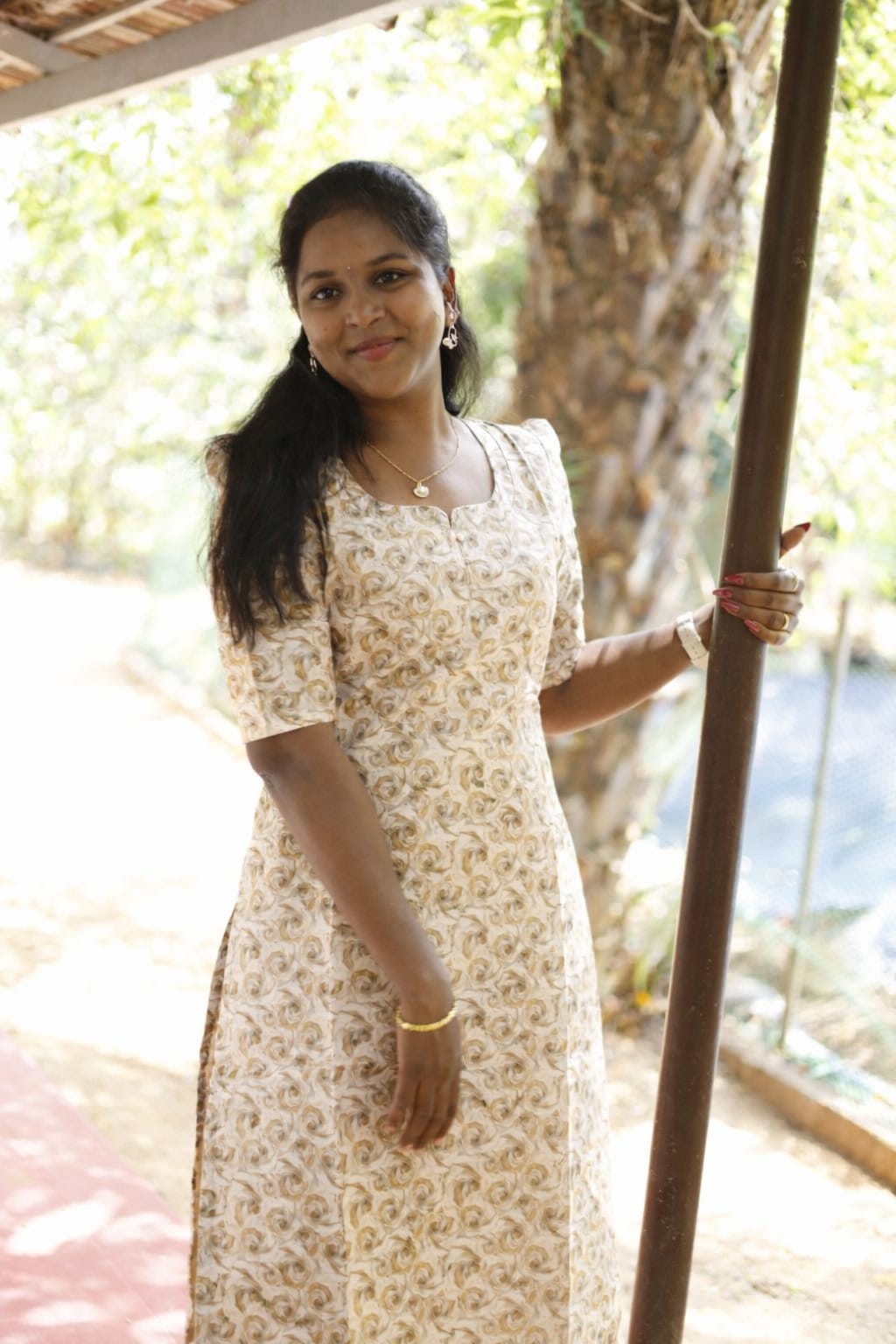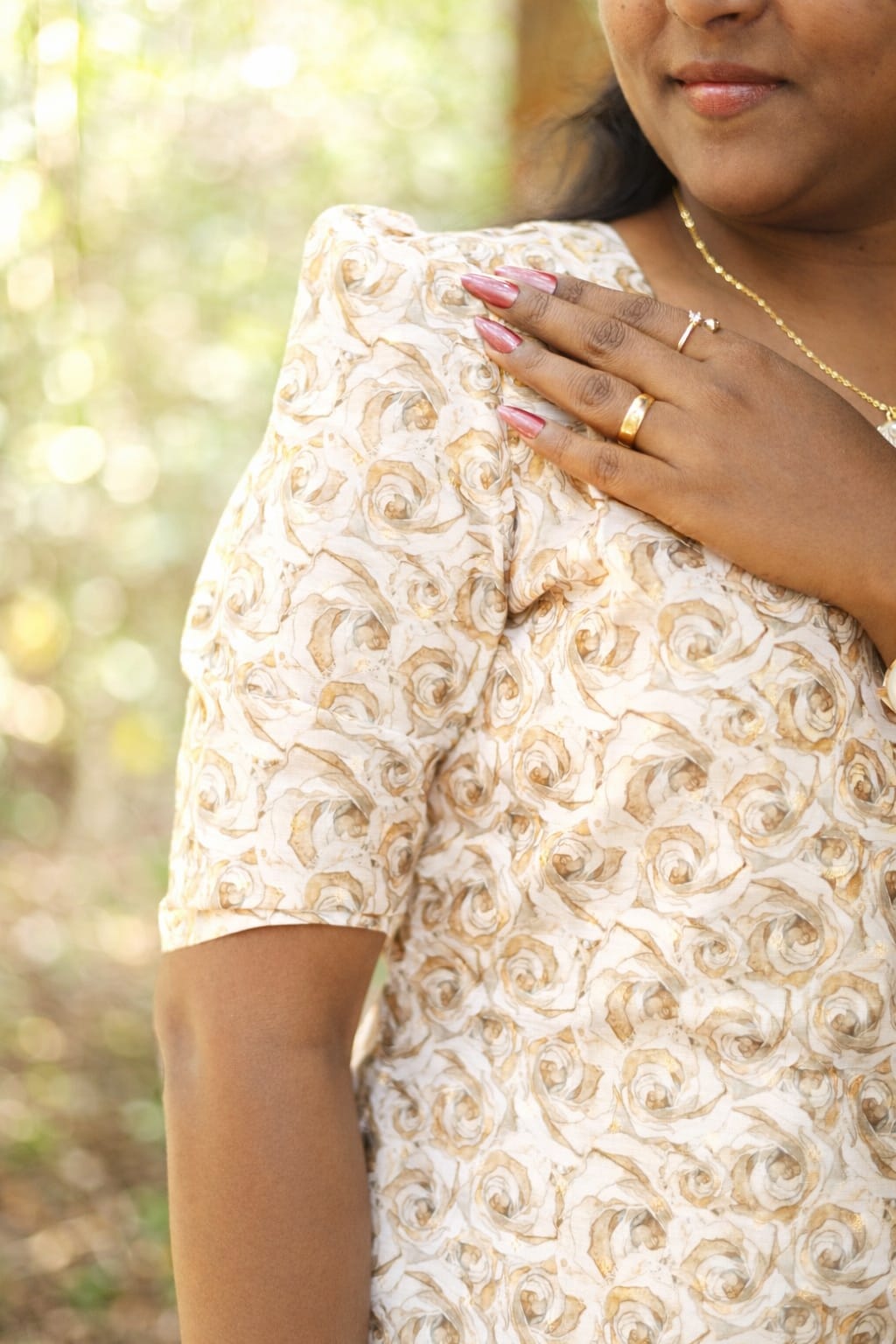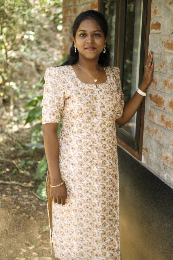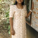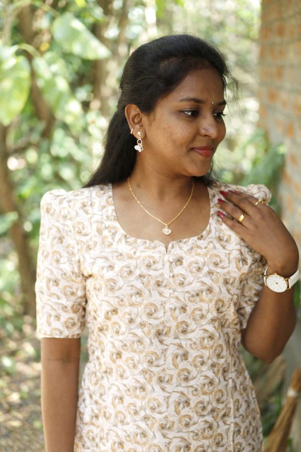 A graceful straight-cut kurti in a soft cream shade featuring elegant sand brown swirl prints. Designed with short puff sleeves and a modest round neckline with a small front slit, this dress offers a comfortable yet stylish look, perfect for casual wear, office wear, or simple outings. The subtle print and soft colors give it a classy and neat appearance.