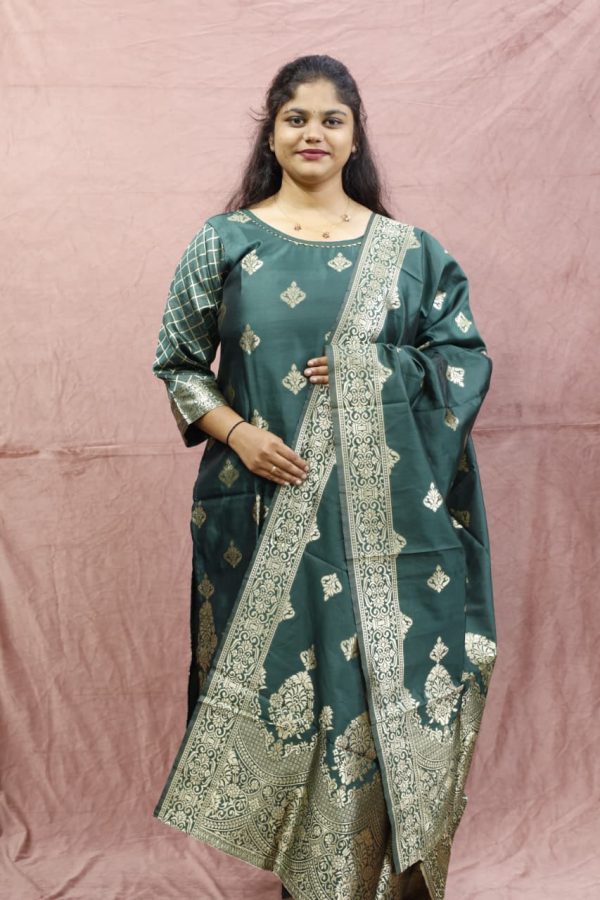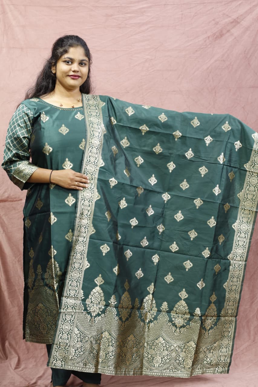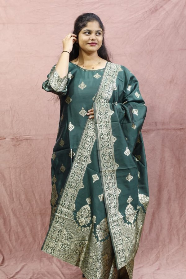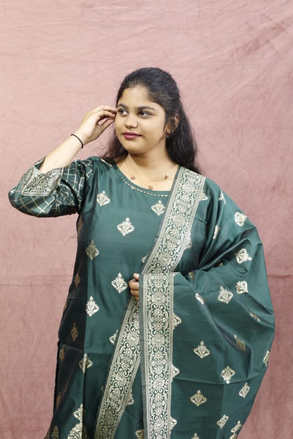 Step into timeless elegance with our Emerald Royal Grace Suit Set. Crafted in a rich deep emerald green shade, this outfit features delicate golden motifs across the kurta and a beautifully detailed zari-inspired border. Paired with a matching dupatta adorned with intricate traditional patterns and a coordinated bottom, this set is perfect for festive occasions, family gatherings, and special celebrations. A graceful blend of classic charm and modern sophistication.
