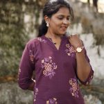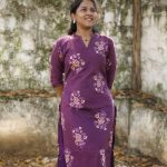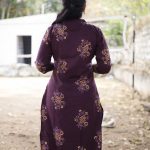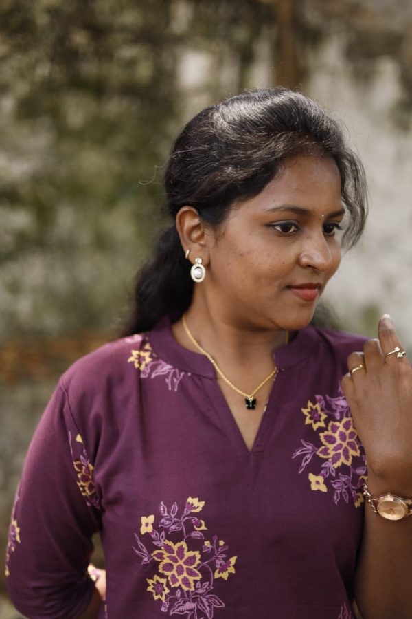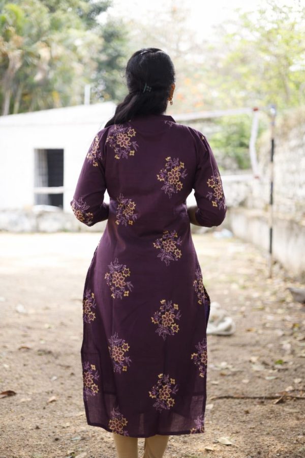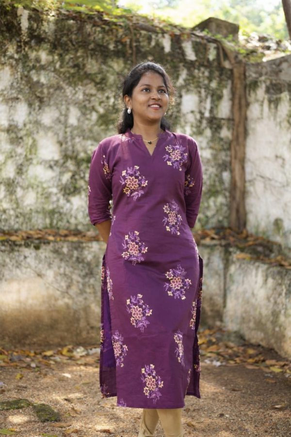 An elegant deep plum purple straight-cut kurta featuring delicate yellow and soft pink floral prints. Designed with three-quarter sleeves and a subtle V-neck, this piece offers a graceful, everyday ethnic look with a touch of floral charm