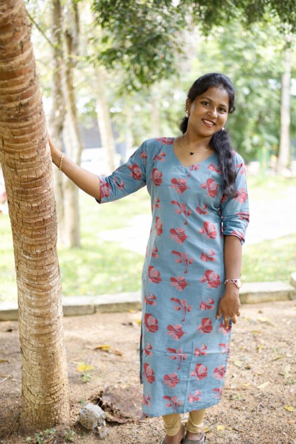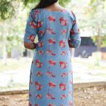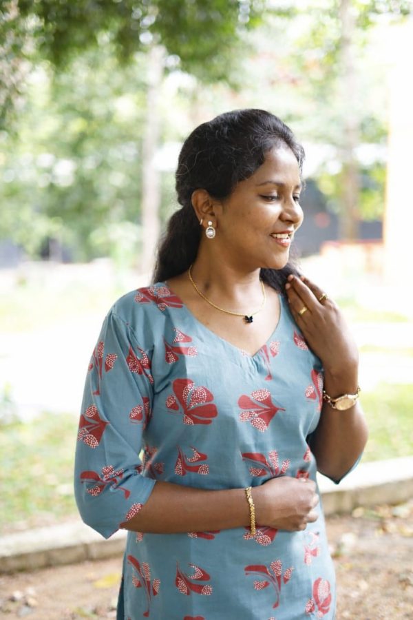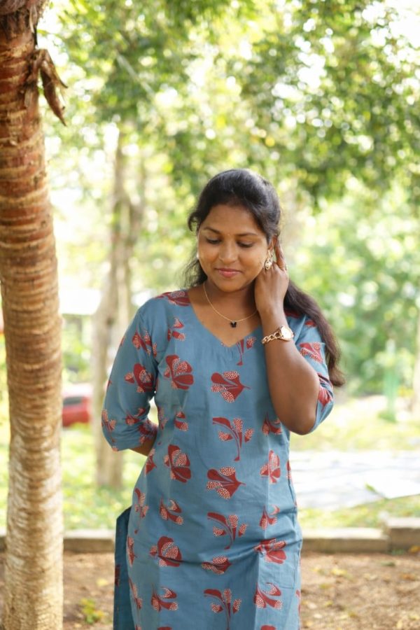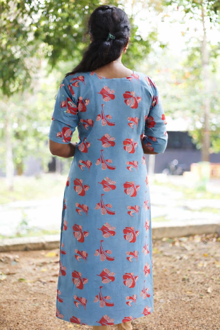 A graceful dusty blue straight-cut kurti adorned with elegant red floral motifs. Designed with a soft V-neck and three-quarter sleeves, this piece offers a perfect blend of comfort and charm. The breathable cotton fabric makes it ideal for everyday wear, casual outings, or office styling with leggings or palazzos. Effortlessly simple, naturally beautiful.