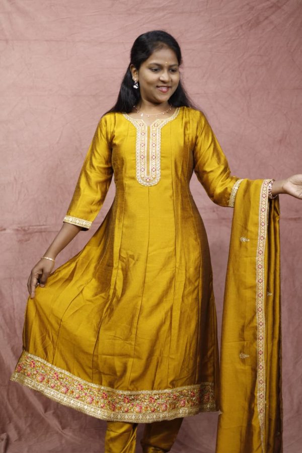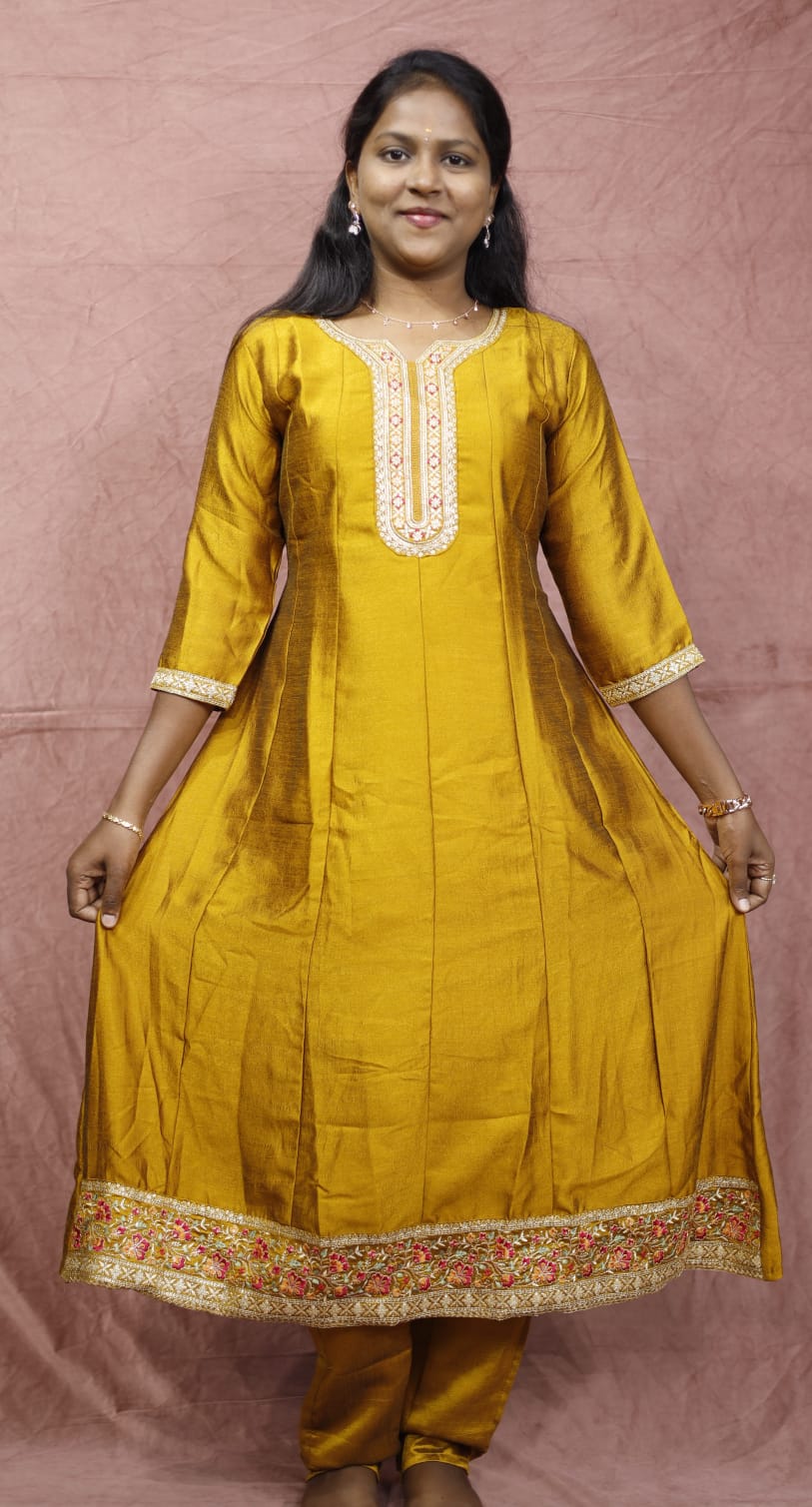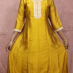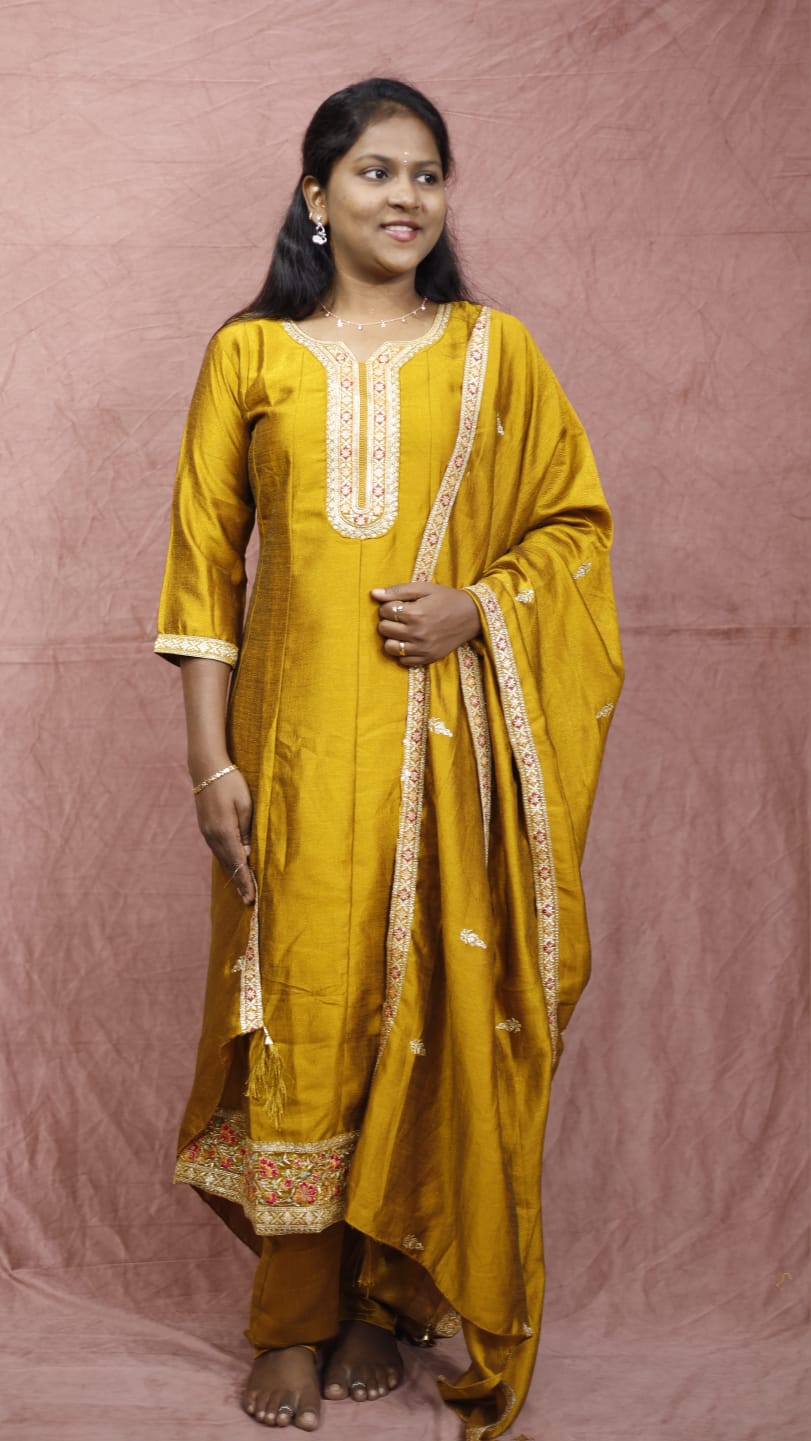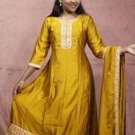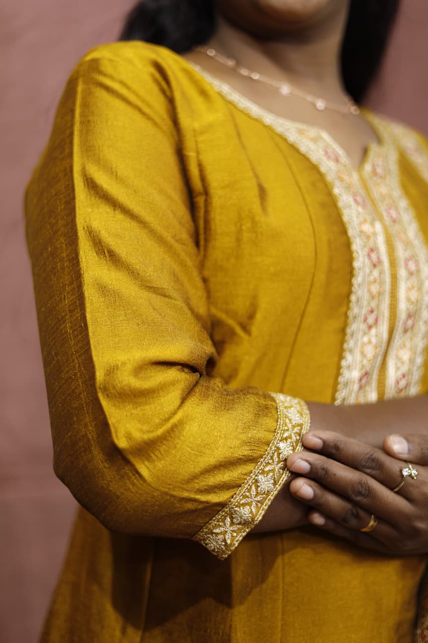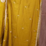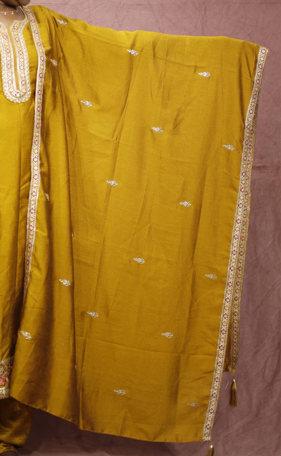 A stunning mustard gold ethnic set featuring a straight-cut kurta with delicate embroidered neckline detailing and rich border work at the hem. Paired with matching pants and a beautifully bordered dupatta, this outfit blends traditional charm with a soft, regal glow — perfect for festive gatherings and special occasions.