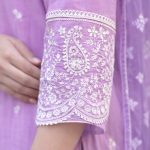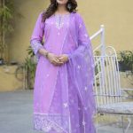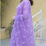 Elegant Lavender cotton kurti set featuring delicate white embroidery, paired with matching pants and a soft embroidered dupatta — perfect for festive and graceful everyday wear.