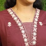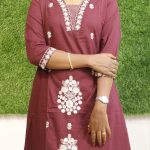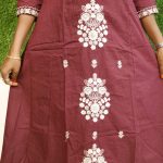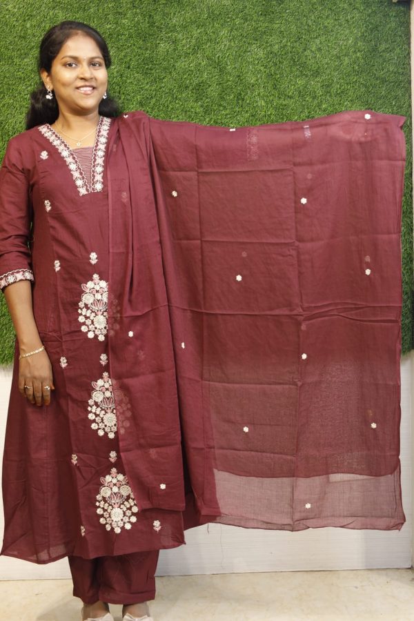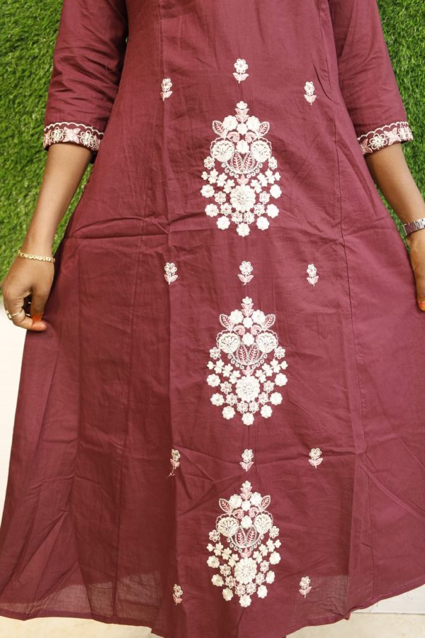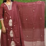 Elegant deep maroon kurti set featuring delicate floral embroidery on the front and neckline. Designed with a straight-cut silhouette, three-quarter sleeves, and a matching dupatta, this outfit offers a perfect blend of traditional charm and everyday comfort. Ideal for casual wear, office wear, or small gatherings.