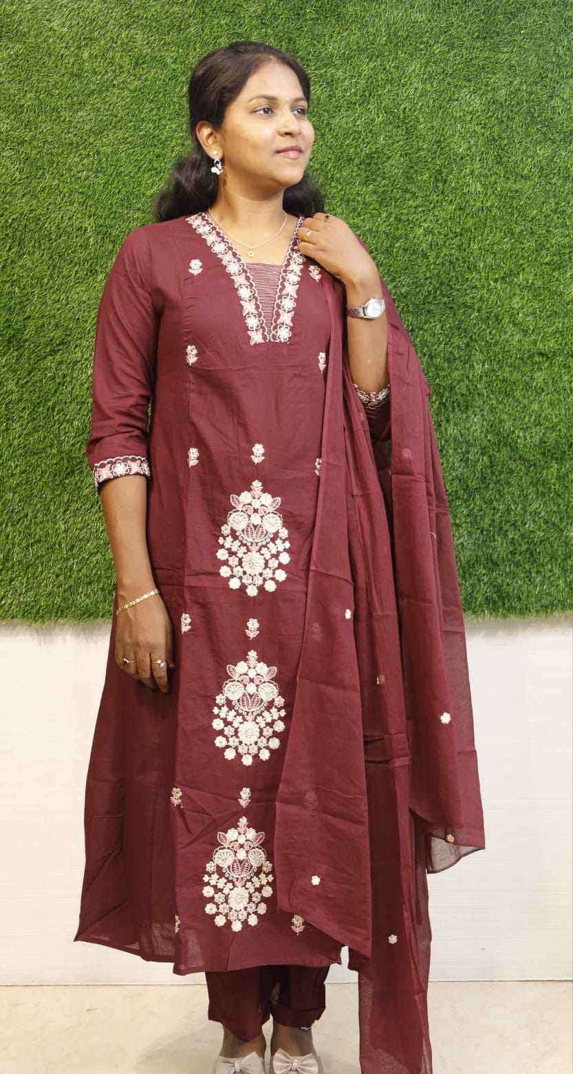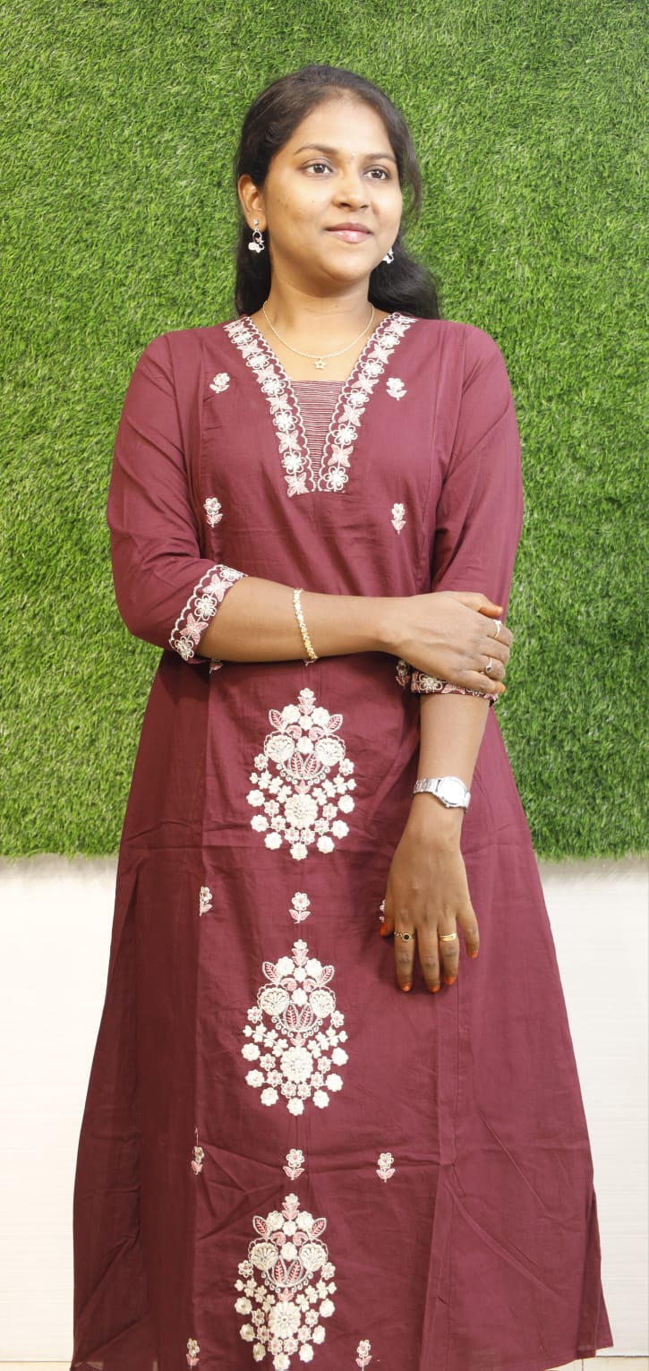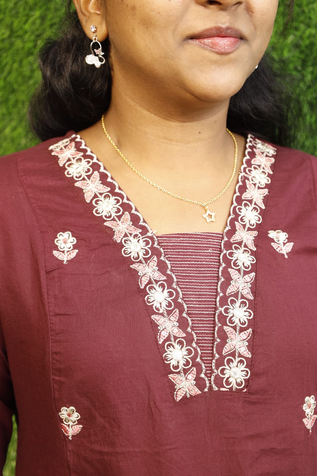 Elegant deep maroon kurti set featuring delicate floral embroidery on the front and neckline. Designed with a straight-cut silhouette, three-quarter sleeves, and a matching dupatta, this outfit offers a perfect blend of traditional charm and everyday comfort. Ideal for casual wear, office wear, or small gatherings.