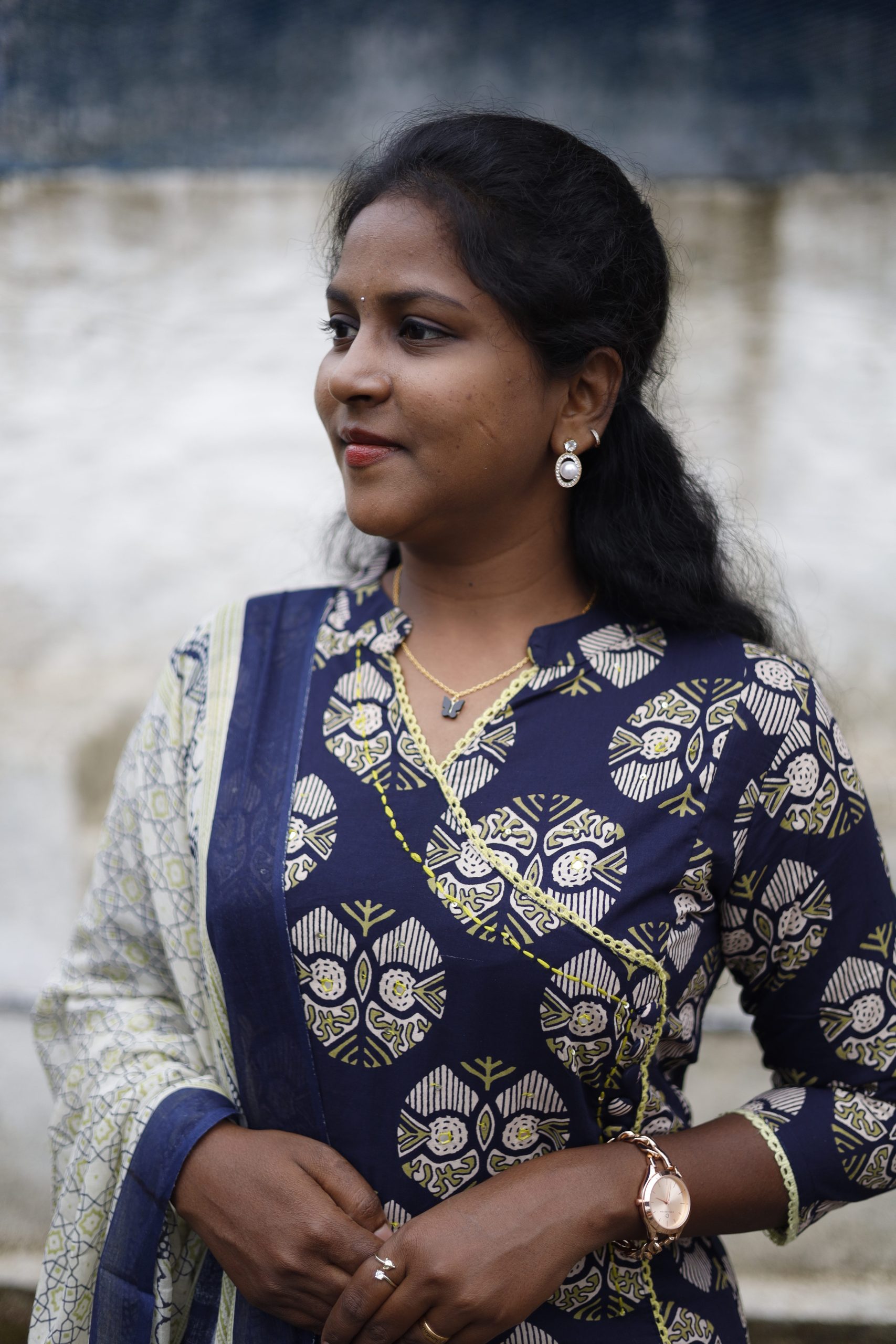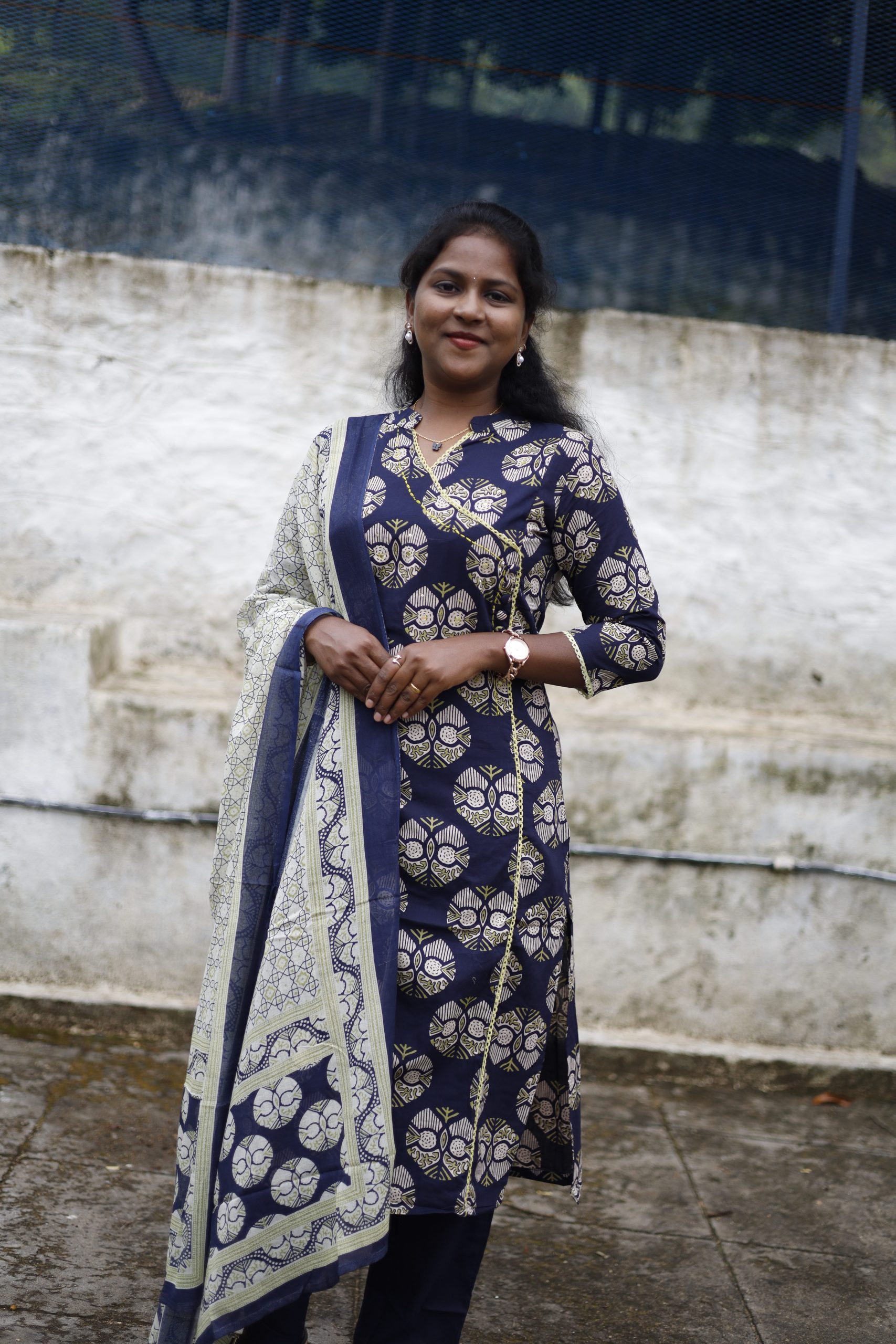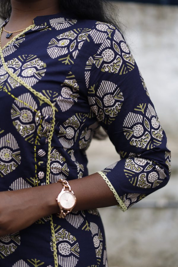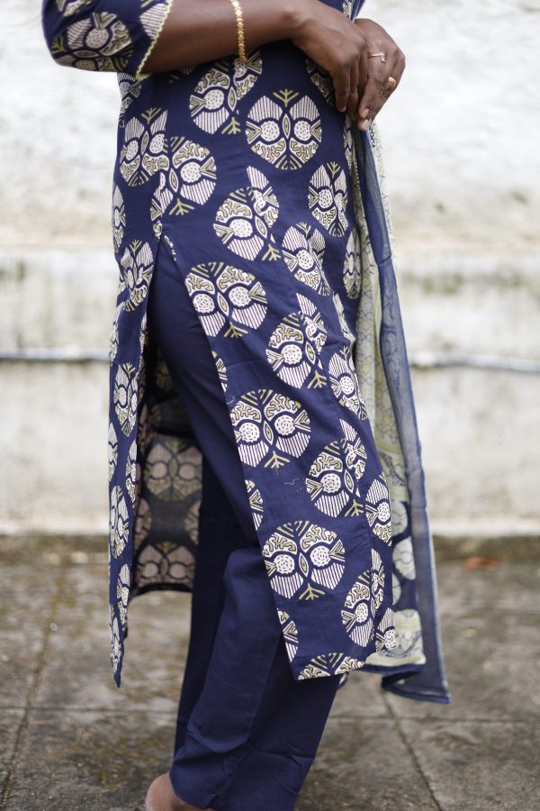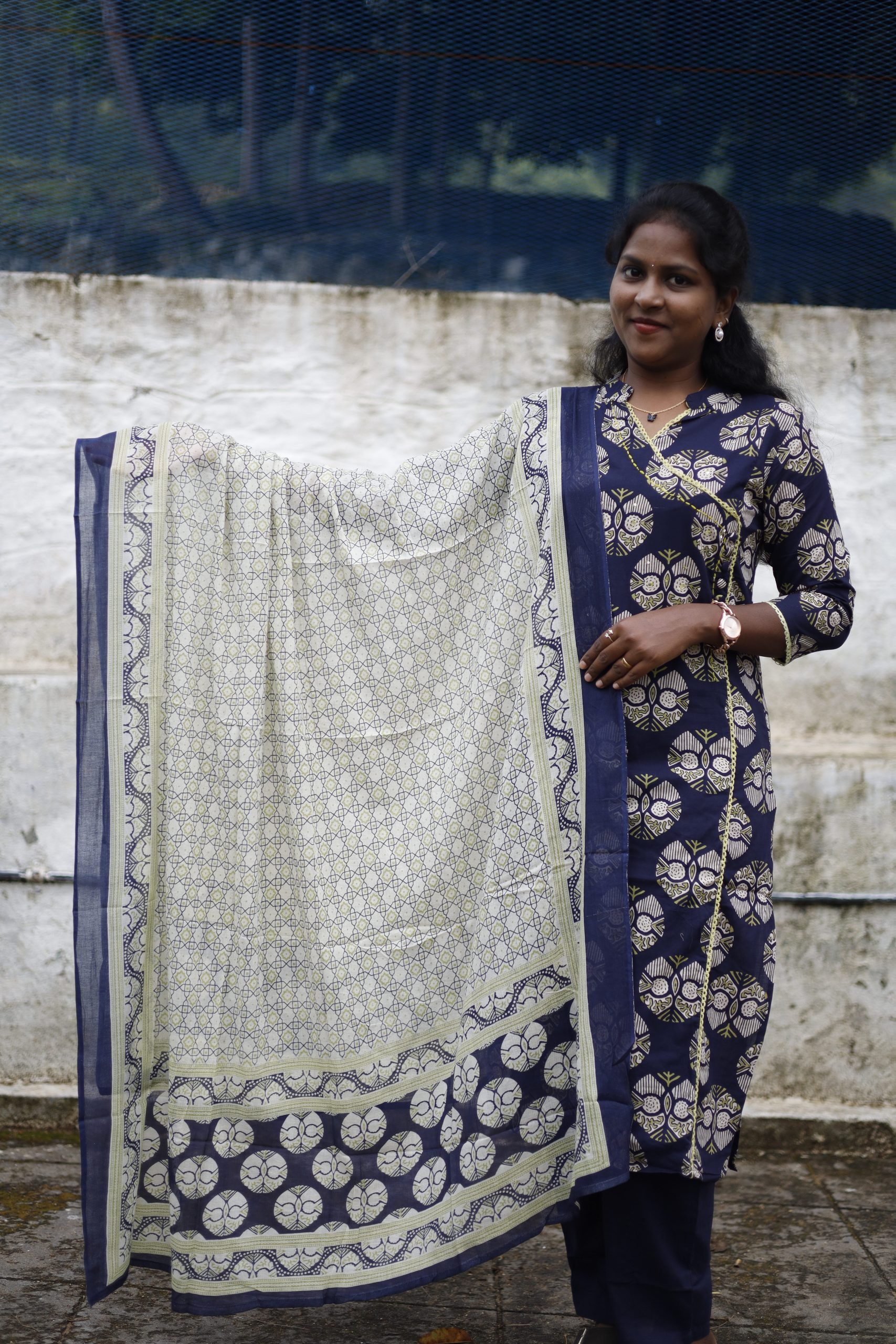 Elegant and timeless, this navy blue kurti set features intricate cream ethnic motifs that add a touch of traditional charm. Designed with a flattering straight cut and three-quarter sleeves, it comes paired with a beautifully coordinated printed dupatta. Perfect for office wear, casual outings, or festive gatherings, this outfit blends comfort with classic sophistication.