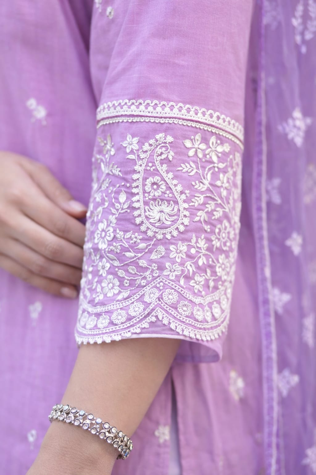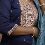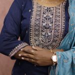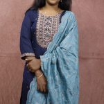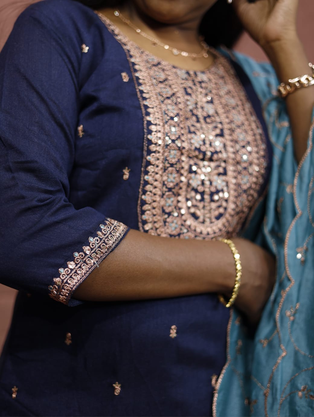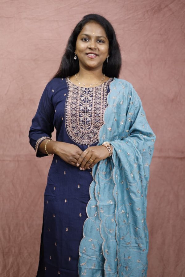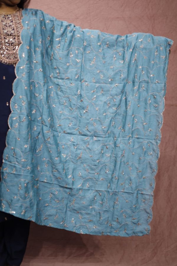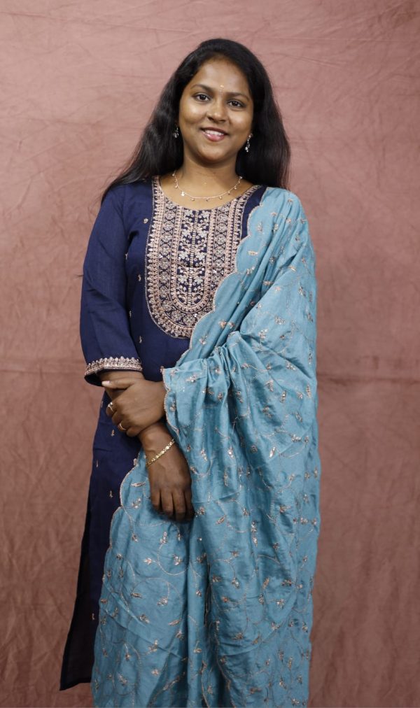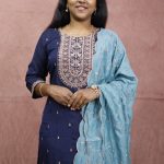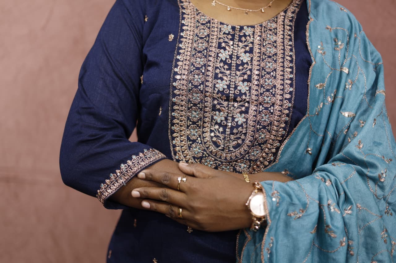 A graceful navy blue ethnic set featuring intricate golden embroidery on the neckline and delicate motifs throughout the kurta. Paired with a soft teal dupatta adorned with subtle floral threadwork and scalloped edges, this outfit blends classic charm with modern sophistication — perfect for festive gatherings and special occasions.