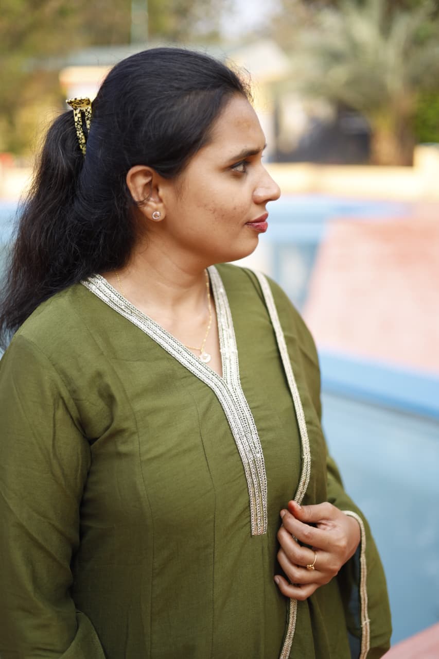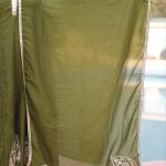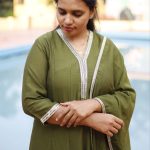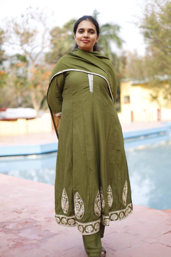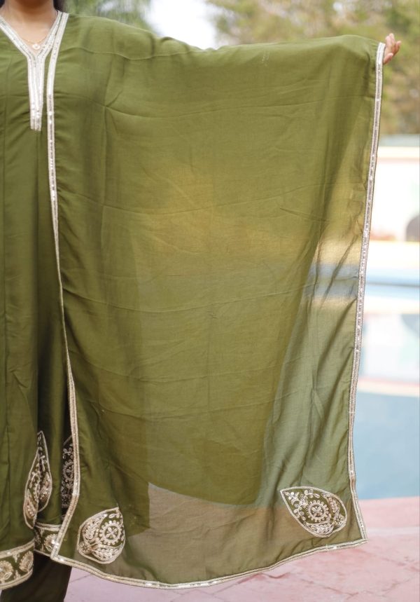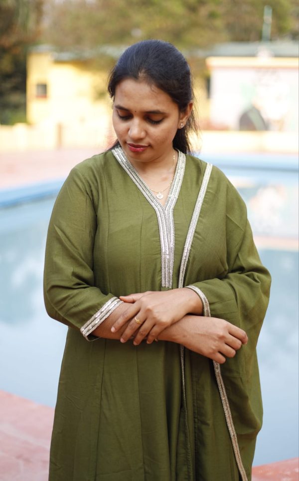 A timeless olive green Anarkali set crafted in a soft, flowy fabric, highlighted with delicate gold embroidery on the hem and neckline. The subtle detailing and graceful flare create a refined, elegant silhouette. Paired with a matching dupatta, this ensemble is perfect for festive gatherings, family functions, and elegant day events.