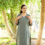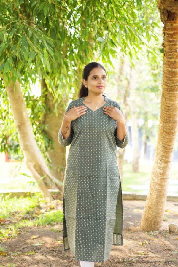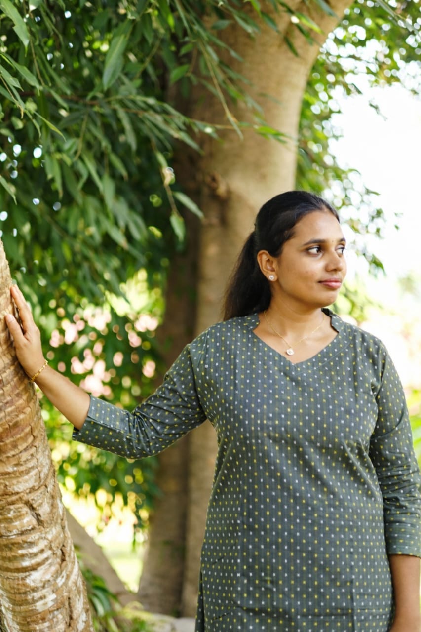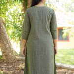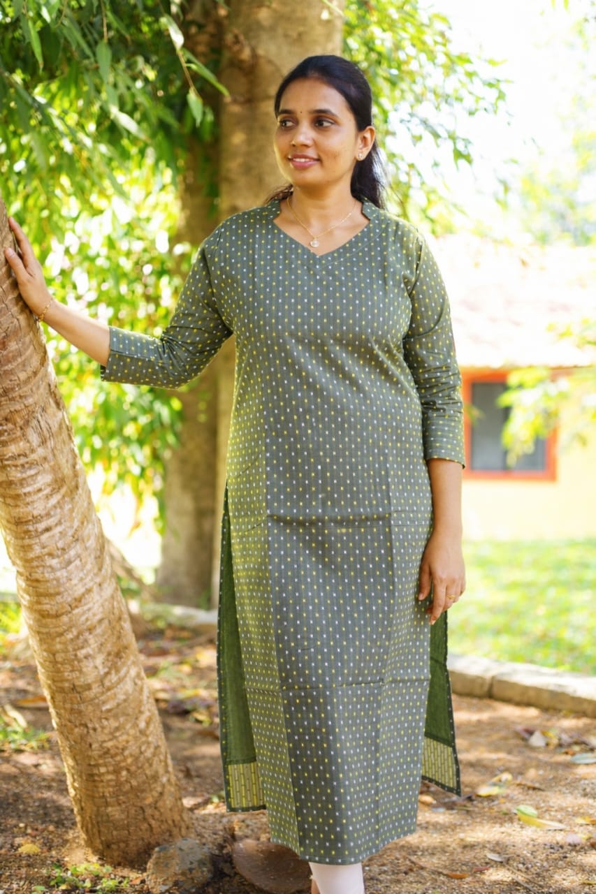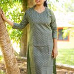 An elegant olive green kurti set adorned with subtle mustard micro-dot patterns, designed for effortless everyday style. Featuring a classic V-neckline and three-quarter sleeves, this piece blends comfort with minimal sophistication. Perfect for casual outings, office wear, or relaxed festive gatherings, it offers a graceful silhouette with a modern touch.