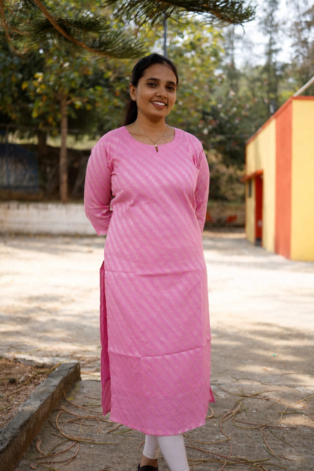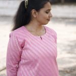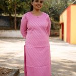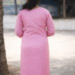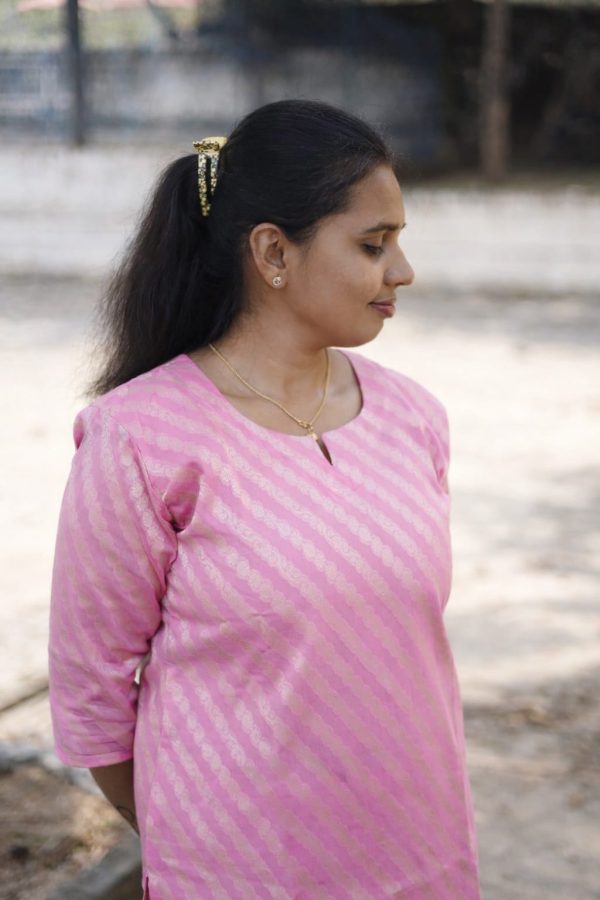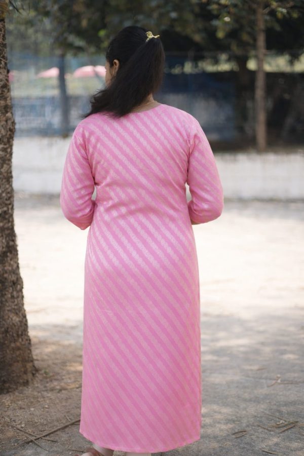 A beautifully tailored straight-cut kurti in a delicate baby pink shade, featuring subtle diagonal woven patterns that add texture and charm. The three-quarter sleeves and knee-length silhouette give it a clean, graceful look, perfect for casual outings or everyday wear. Paired effortlessly with light leggings, it creates a simple yet classy style.