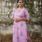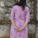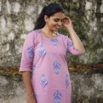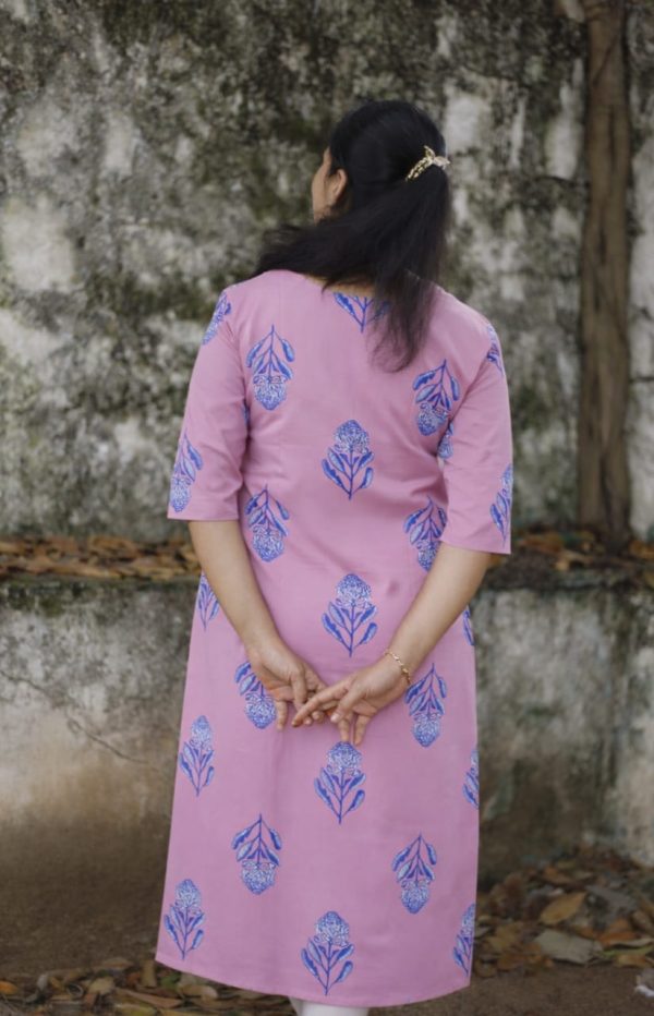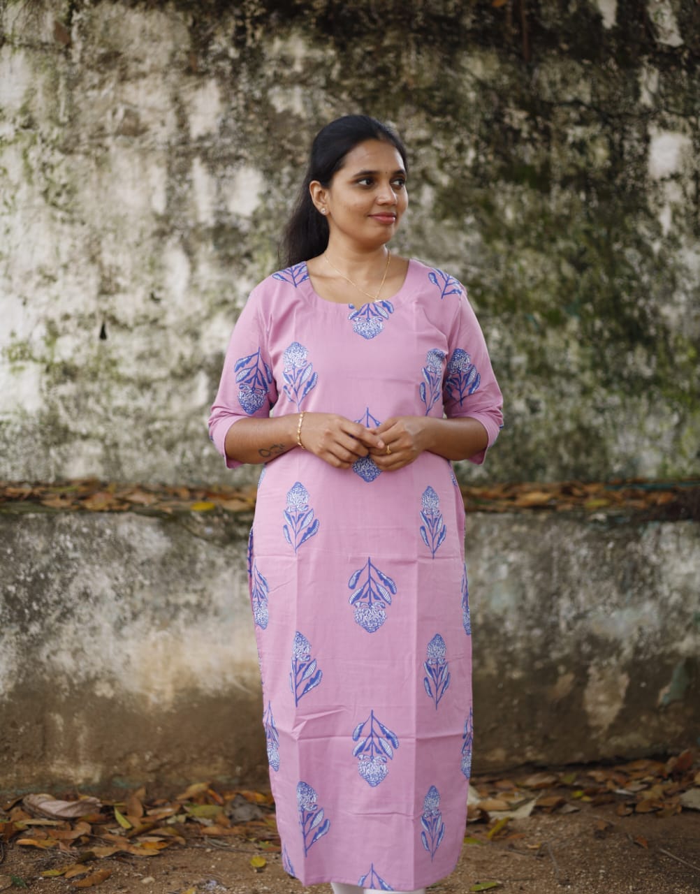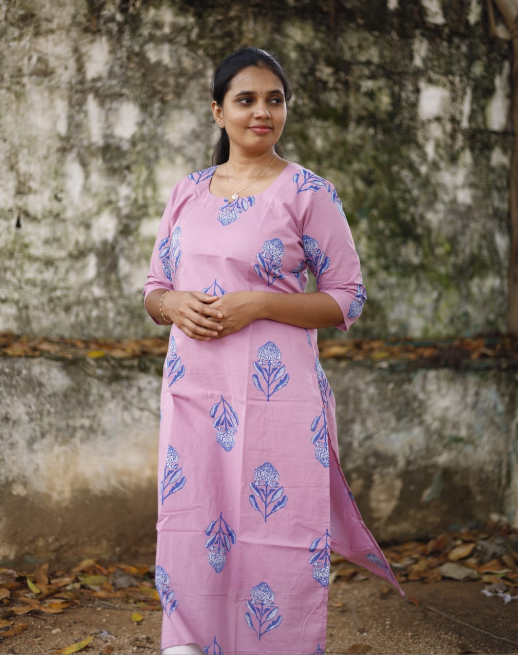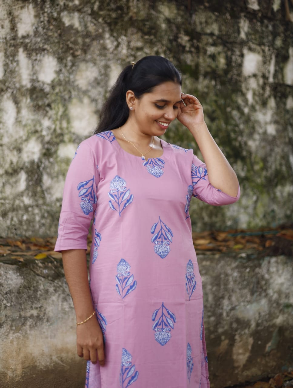 A graceful blush pink cotton kurti adorned with elegant indigo blue floral block prints. Designed with a round neckline and comfortable three-quarter sleeves, this straight-cut silhouette offers effortless everyday elegance. Lightweight, breathable, and perfect for casual outings or workwear styling.