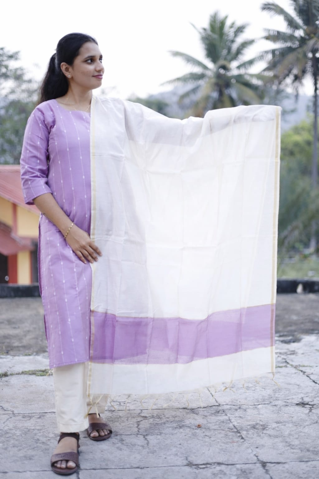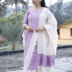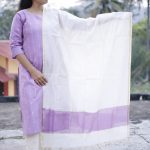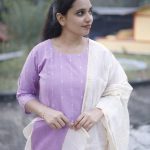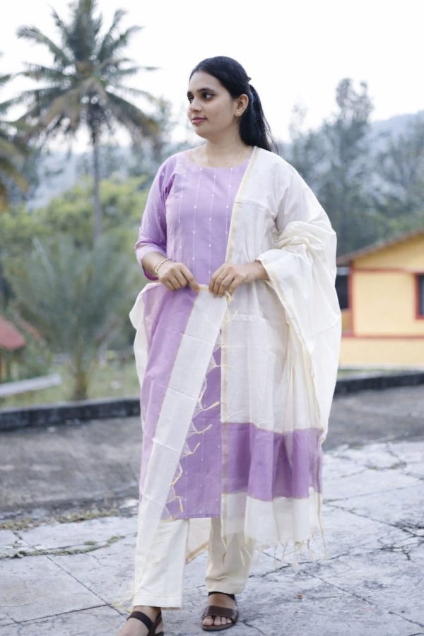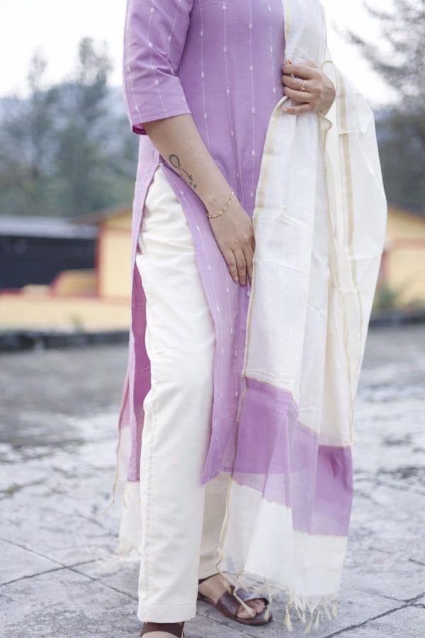 The Lavender Mist Cotton Set is a graceful blend of subtle elegance and everyday comfort. Crafted in a soothing soft lavender shade with delicate vertical detailing, this kurti is paired with an airy ivory dupatta accented by a refined gold border and matching lavender panel. Finished with comfortable off-white bottoms, this set is perfect for festive gatherings, office wear, or elegant day outings.